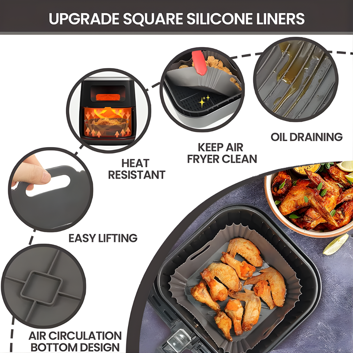 Instead of food burning onto metal baskets or grease dripping everywhere, the silicone liner catches crumbs, oil, and sauces while still allowing hot air to circulate properly. That means crispy food on the outside, tender food on the inside, and way less cleaning after.