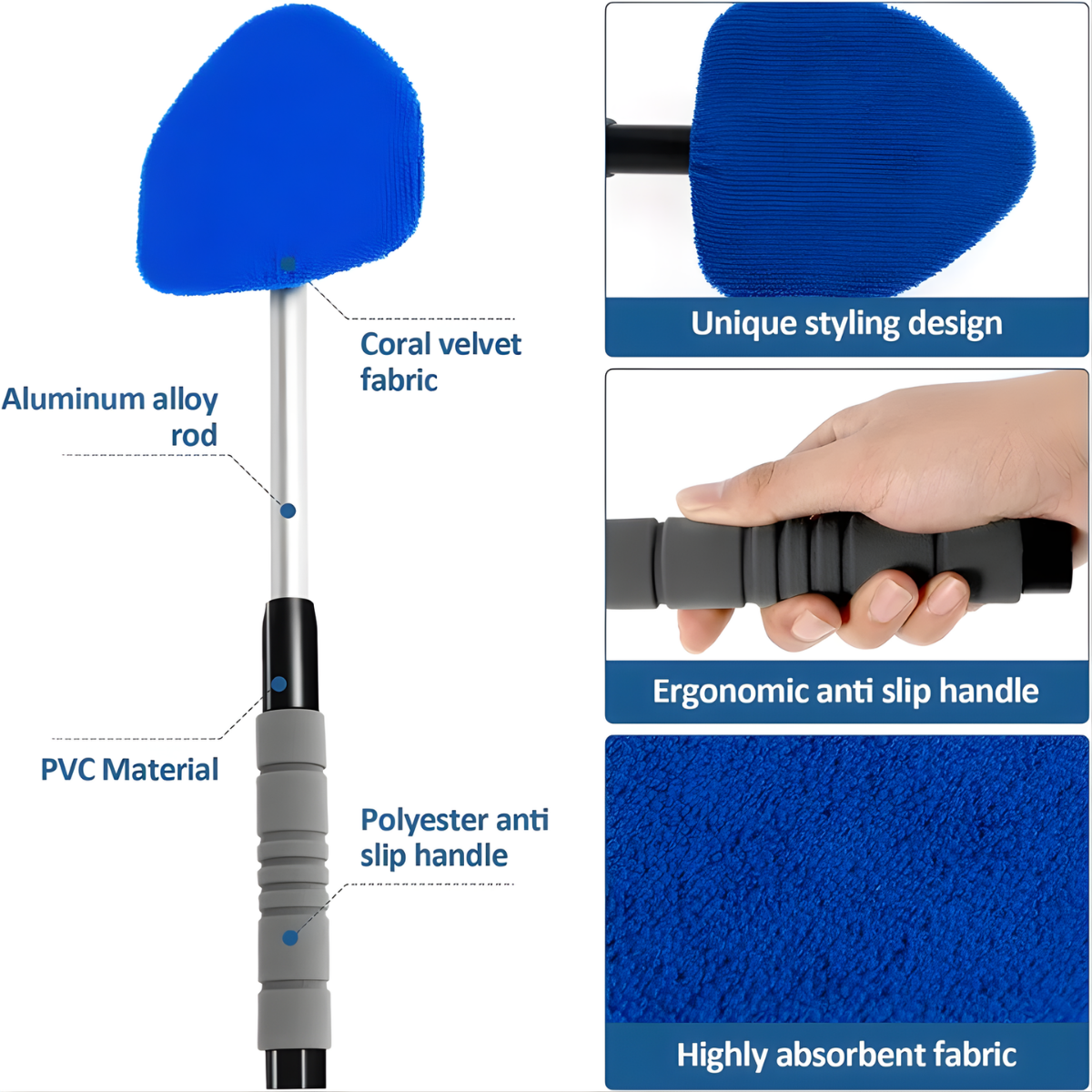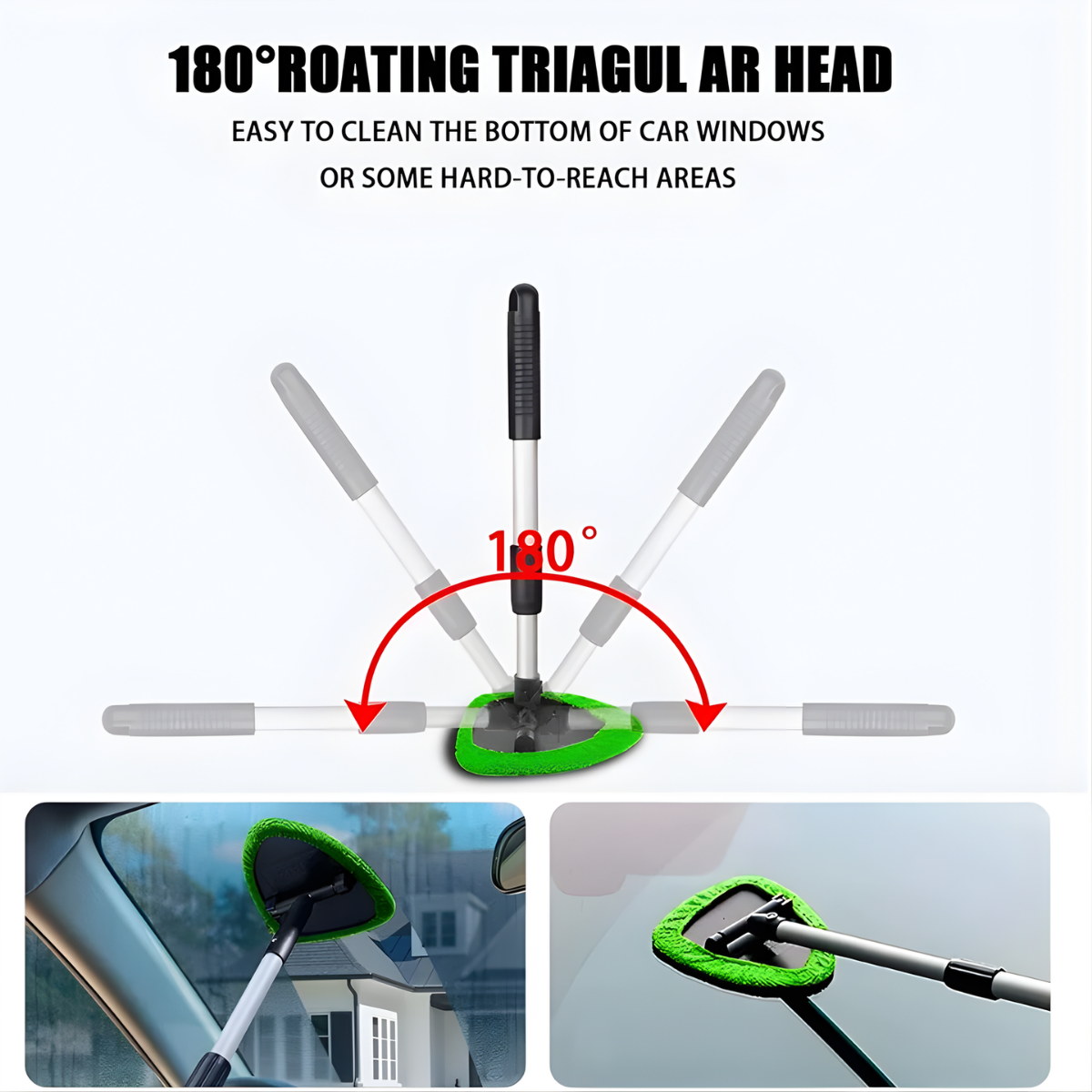 The adjustable handle and 180° rotating head make cleaning your car windows much easier. No more bending or awkward stretches! -