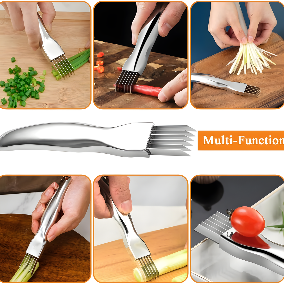 Tired of spending too much time chopping vegetables? This green onion chopper makes slicing and dicing a breeze! With its sharp stainless steel blades and ergonomic handle, you can chop onions, vegetables, and fruits in seconds. Perfect for any kitchen, this easy-to-use and clean tool saves you time and makes meal prep fun and simple. Say goodbye to the hassle of knife chopping!