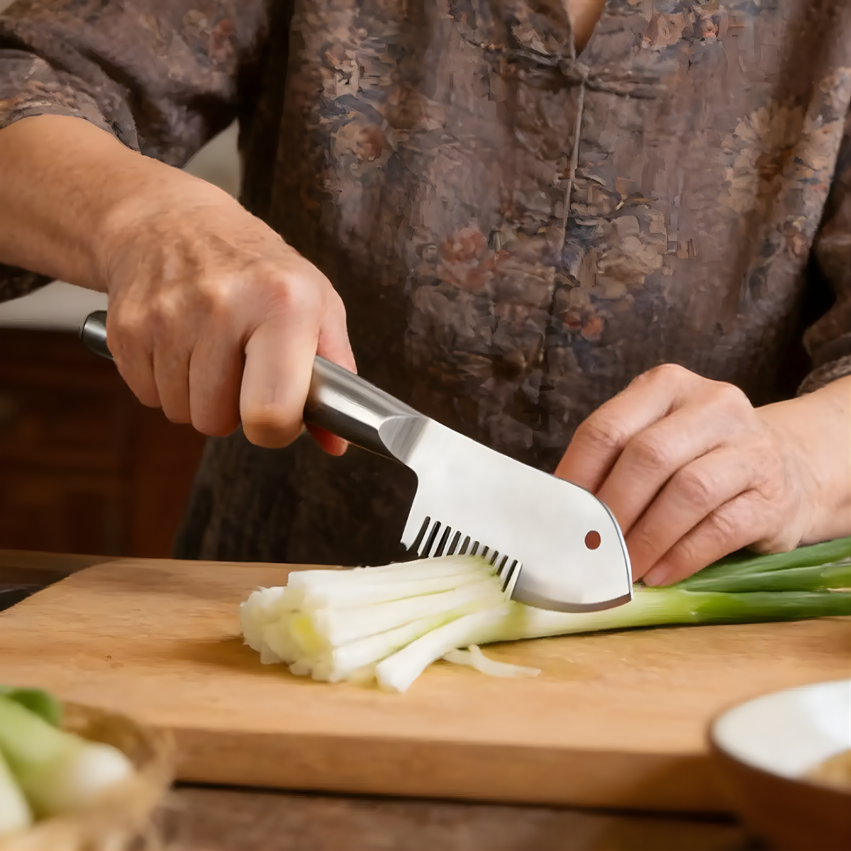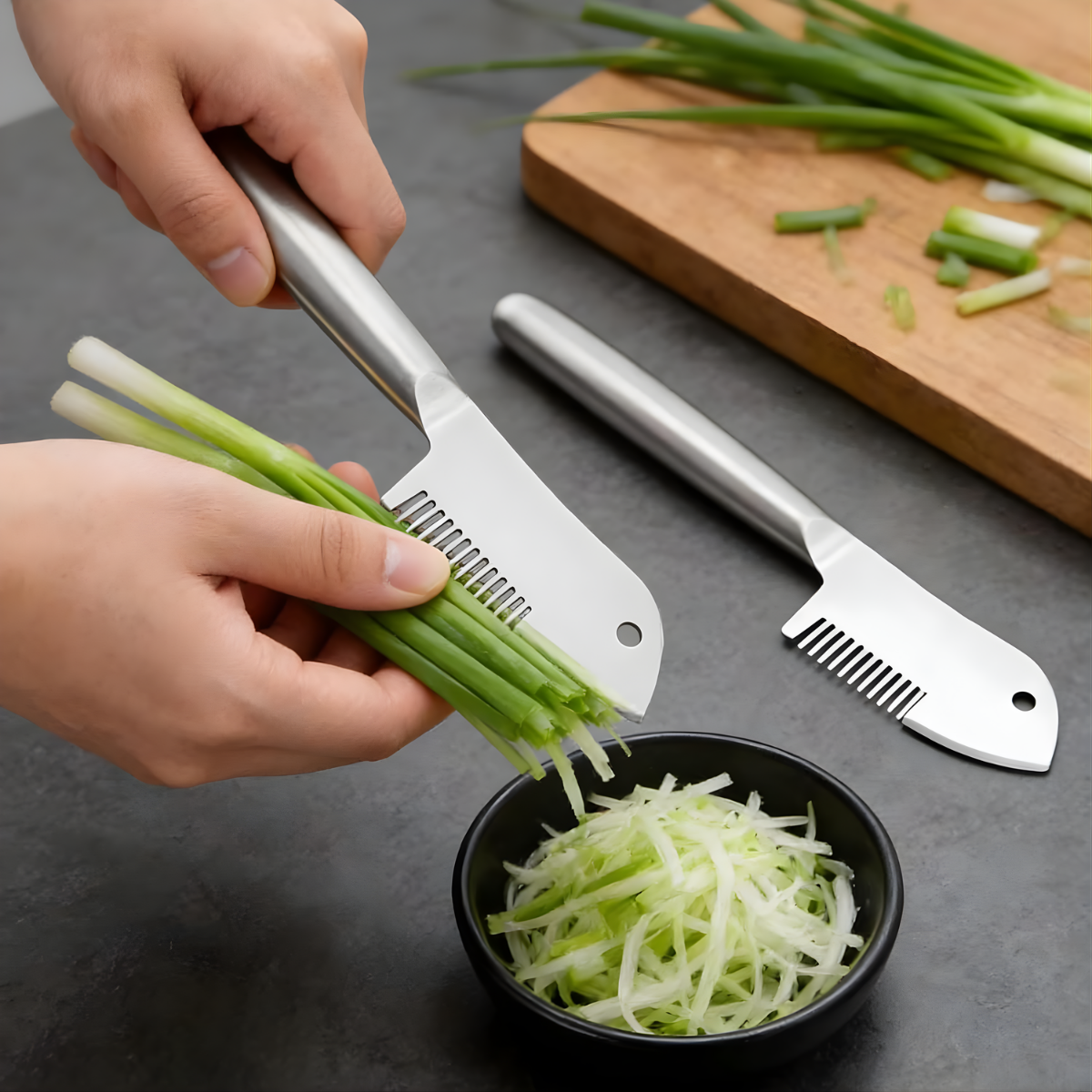 Instead of struggling with knives and uneven cuts, you simply glide this tool over your scallions and get clean, uniform shreds instantly. No mess flying around. No uneven chunks. No time wasted.