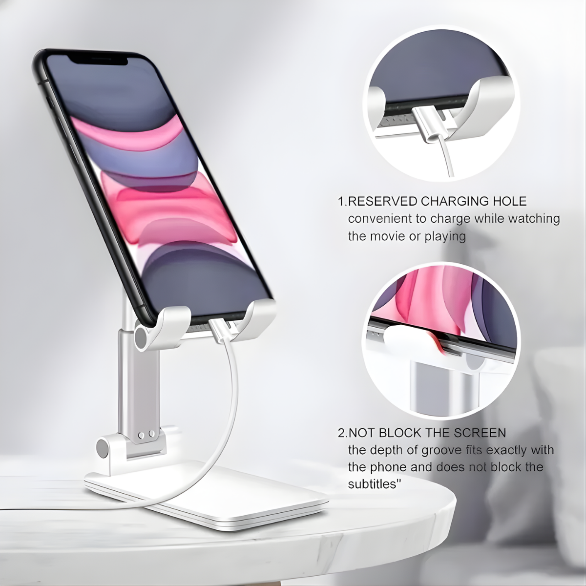 No more squinting at a phone screen! Adjust the stand for the perfect angle, whether you’re sitting at your desk or laying in bed.