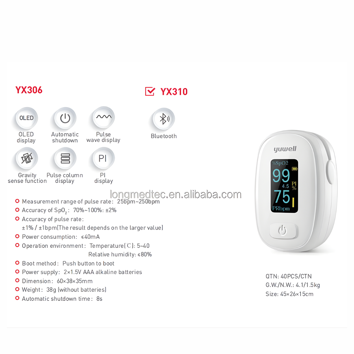Measurement Range: Oxygen saturation (SpO2) 70%–100%, Pulse rate 25bpm–250bpm